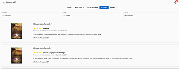 Right now you can sort by platform, books (and series, IP, Pen name, Universe, whatever if you use the tagging feature we include) and from there by most positive, most negative, and most recent. Soon we’ll be adding a “sort by star rating” as many people asked me for that at NINC. We’re going to add to that by offering a “WordCloud” feature that will scrape the text from all your reviews and give you a cloud for keyword and genre help.