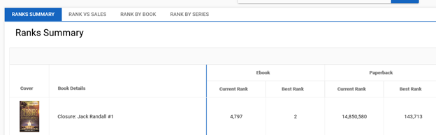 Rank tracking. We do ranks by Current, Best, Ranks by Book, Ranks vs Sales, Ranks by Series, and you can adjust those columns any way you wish.