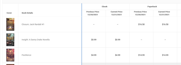 Price Tracking: We monitor all your prices and alert you to any changes much like we do the KU Status tracker. This is for both Zon’s sudden changes and to detect pirate activity. You’ll see the previous price, current price, and how long that price has been in effect. There’s also a Historic Price vs Date chart that you can filter the usual dozen ways we offer.