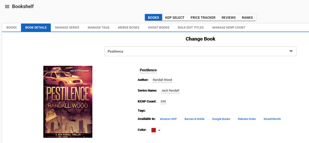 - Title, Author, Series Name, KENP Count, Platform(s), Color code. Links to store page(s)