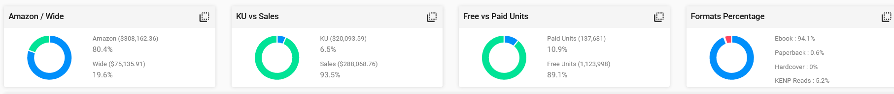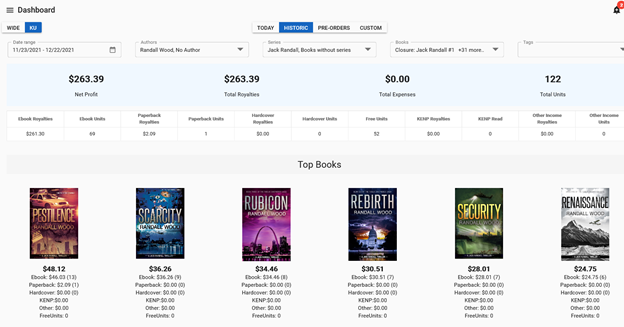 Note II: KENP Count. We have it the same as BookReport does but we’ll soon be adding a Page Reads to Full Reads calculator. Depending on your choice the charts will adjust to show what you want to see. This will use the number that Amazon assigns your book but you have the option to change that if you don’t agree with it. Hoping to have that out next month.